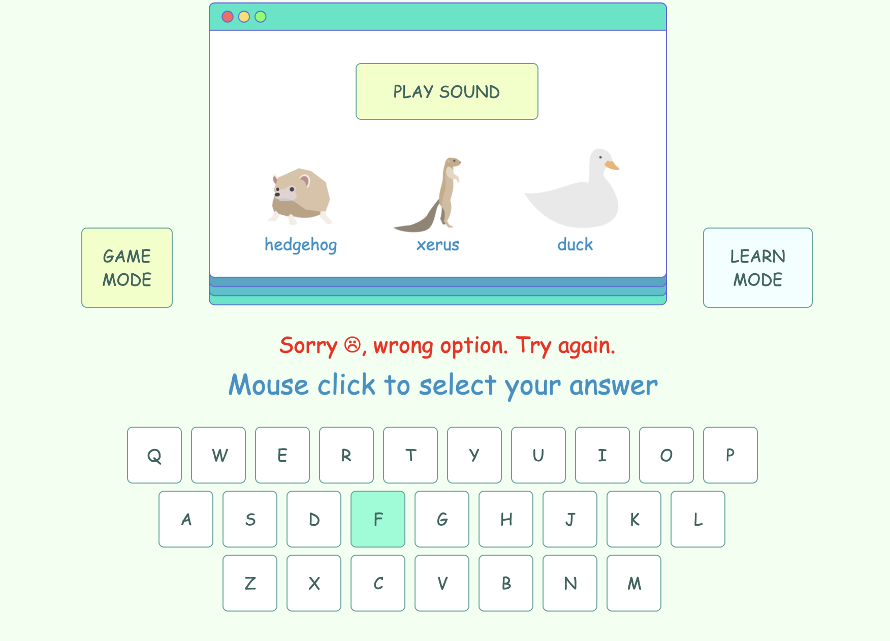 3. In Game Mode, kids have to identify the correct animal by its sound from 3 options.